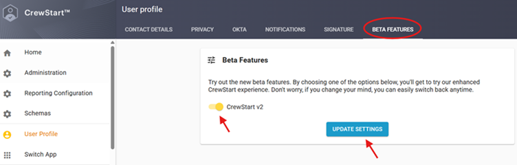 - Toggle CrewStart v2 on (or off if needed), then click Update Settings.